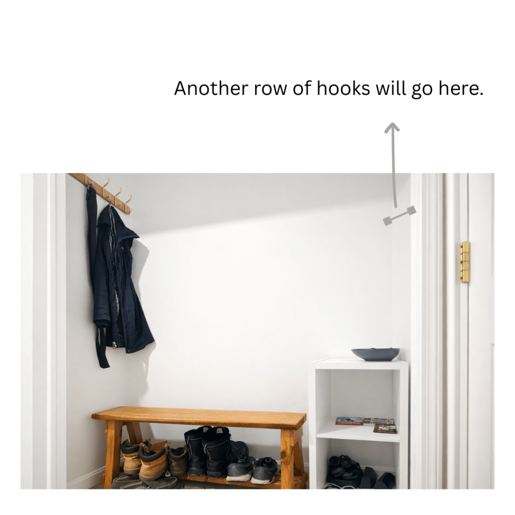 The next upgrade to the area we will be another set of hooks on the right wall. These hooks will be used for gloves, hats, and small purses or bags. They will be attached a 1″x 3″ piece of wood stained like the one on the left wall.