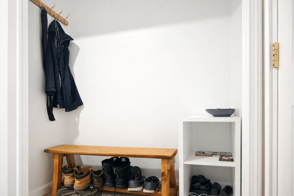 The first change we made to the area was adding a short wooden bench. This bench was a part of a dining set from a previous house that conveniently was the same color as the stain we had used on our other wooden additions. Nick modified the bench by adding a second board along the bottom so our shoes could be left underneath. I added a super cheap neutral colored rug underneath to prevent water from pooling on the floor.