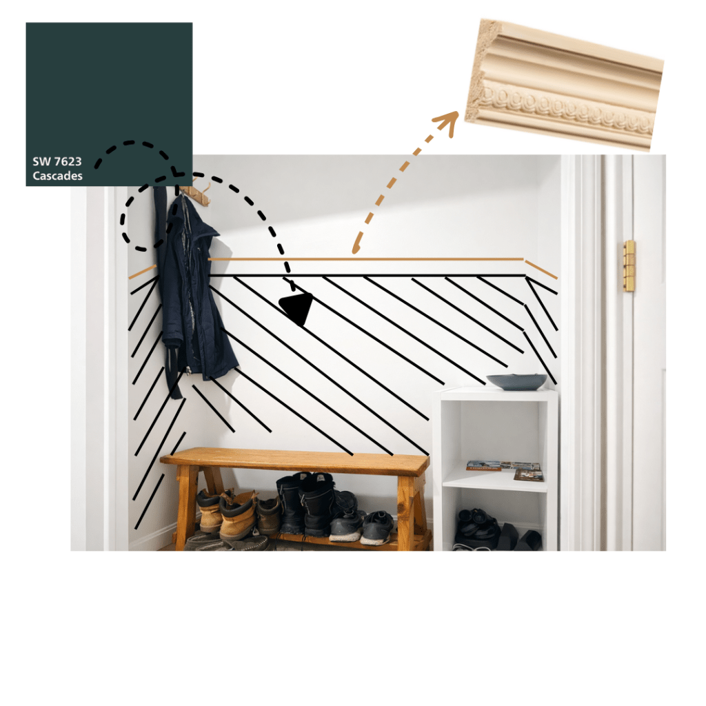 A bigger project we will tackle in the area will be painting the walls from the base boards between 48″ and 54″ inches a deep green called Cascades by Sherwin Williams. Where this deep, jewel tone green meets the white of the remaining wall there will be a ornate flat strip of chair railing. This will hide where the two colors meet, and offer visible separation. If you watch any interior design videos, then you will learn that professionals place things at varying heights along open spaces and near corners. This is a trick to draw the eye up instantly making a room feel bigger. So, vertical decor is a must in a small space!